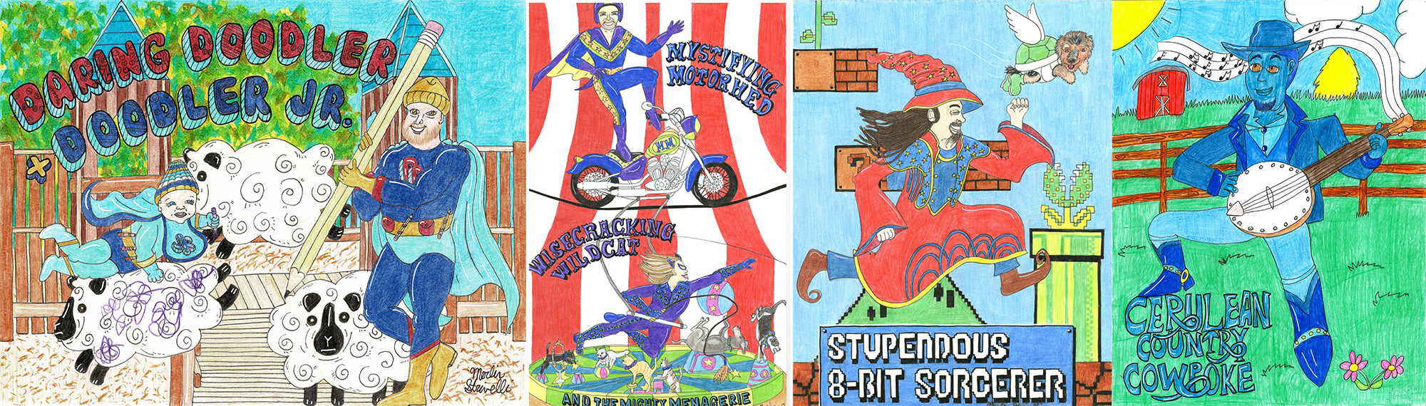 This collection of 13 original acrylic on canvas artworks by Merlin Strivelli is a vivid journey through fantasy, folklore, and imagination. From towering trolls and soaring dragons to mythical beasts, moonlit graveyards, and enchanted forests, each piece captures a moment from a story only Merlin could tell. With bold color choices, expressive brushwork, and a playful sense of adventure, the collection invites viewers into a world where anything is possible and every creature has a tale to share.